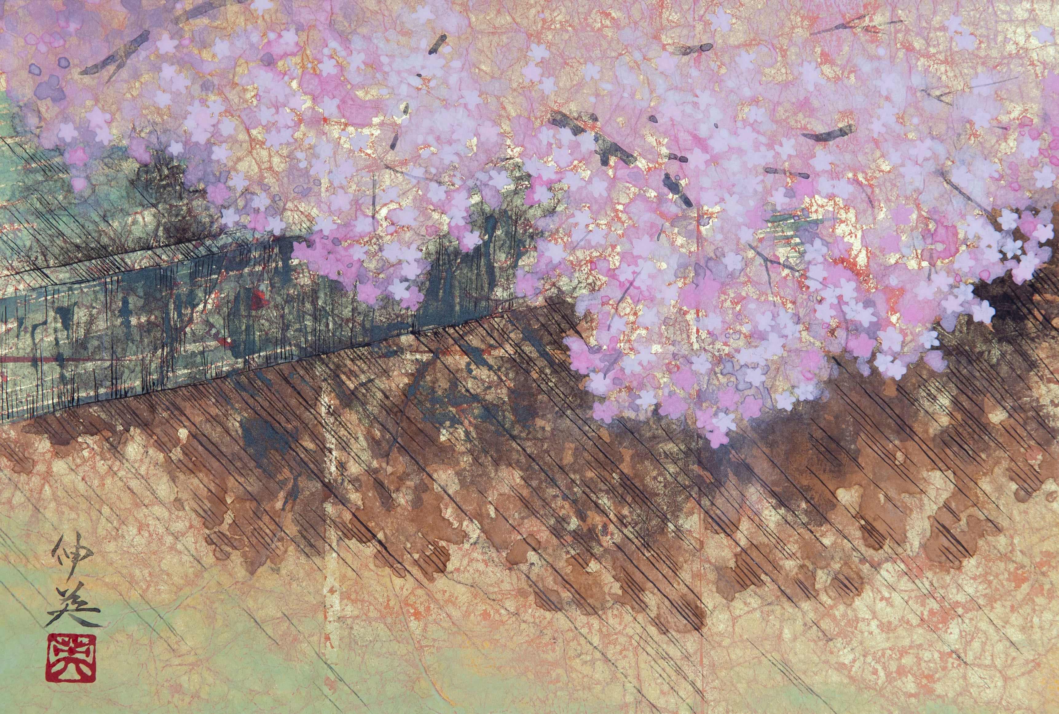 Rendered on crumpled washi paper and accented with gold leaf, this work depicts cherry blossoms in radiant bloom.